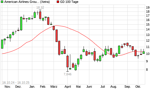 Mit dem Anstieg auf 10,58 EUR hat die American Airlines-Aktie am 15.10.2025 die 100-Tage-Linie nach oben gekreuzt.Die American Airlines-Aktie befindet sich seit dem 06.03.2025 im langfristigen ...weiterlesen