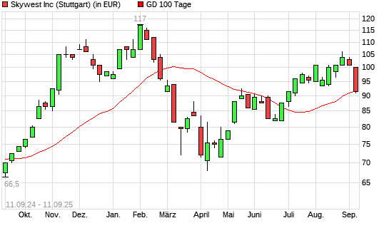 Mit dem Rücksetzer auf 91,00 EUR hat die SkyWest-Aktie am 10.09.2025 die 100-Tage-Linie nach unten gekreuzt.Die SkyWest-Aktie befindet sich seit dem 09.09.2025 im langfristigen Abwärtstrend ...weiterlesen