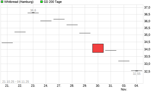 Mit dem Rücksetzer auf 32,96 EUR hat die Whitbread-Aktie am 03.11.2025 die 200-Tage-Linie nach unten gekreuzt.Die Whitbread-Aktie befand sich seit dem 21.10.2025 im langfristigen Aufwärtstrend ...weiterlesen