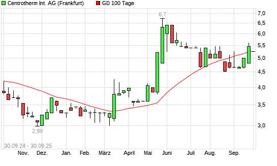 Mit dem Rücksetzer auf 5,25 EUR hat die CENTROTHERM PHOTOV.KONV.-Aktie am 29.09.2025 die 100-Tage-Linie nach unten gekreuzt.Die CENTROTHERM PHOTOV.KONV.-Aktie befindet sich seit dem 30.04.2025 ...weiterlesen