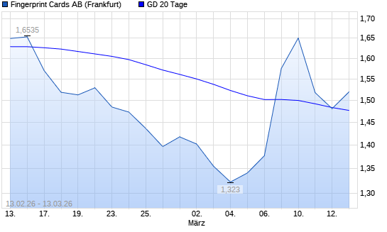 Mit dem Rücksetzer auf 1,48 EUR hat die FINGERPRINT CARDS-Aktie am 12.03.2026 die 20-Tage-Linie nach unten gekreuzt.Die FINGERPRINT CARDS-Aktie befindet sich seit dem 11.03.2026 ...weiterlesen