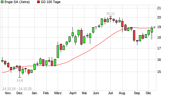 Mit dem Anstieg auf 18,98 EUR hat die Engie-Aktie am 13.10.2025 die 100-Tage-Linie nach oben gekreuzt.Die Engie-Aktie befindet sich seit dem 09.09.2025 im langfristigen Aufwärtstrend und hat ...weiterlesen