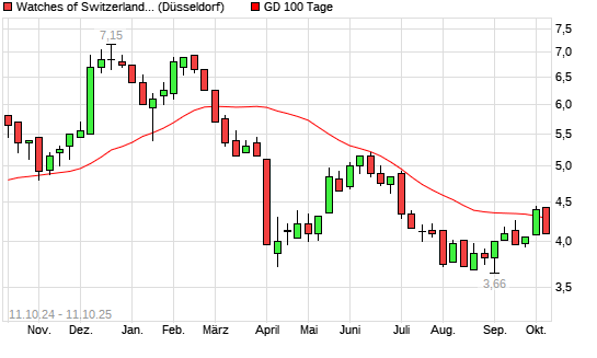 Mit dem Rücksetzer auf 4,28 EUR hat die Watches of Switzerland-Aktie am 10.10.2025 die 100-Tage-Linie nach unten gekreuzt.Die Watches of Switzerland-Aktie befindet sich seit dem 10.03.2025 ...weiterlesen