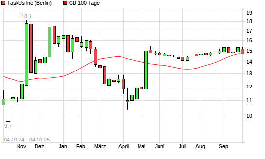 Mit dem Rücksetzer auf 14,60 EUR hat die TaskUs A-Aktie am 03.10.2025 die 100-Tage-Linie nach unten gekreuzt.Die TaskUs A-Aktie befindet sich seit dem 19.05.2025 im langfristigen Aufwärtstrend ...weiterlesen