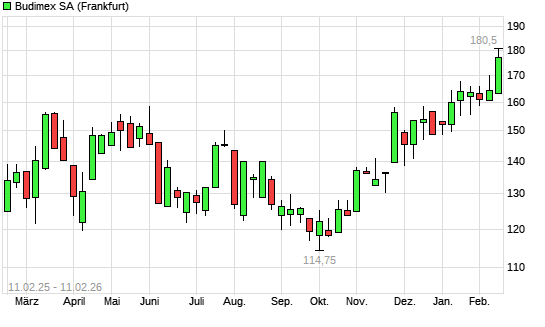 Mit dem Anstieg auf 177,80 EUR hat die Budimex-Aktie (ISIN PLBUDMX00013) am 10.02.2026 ein neues 12-Monats-Hoch erreicht und damit den Kurs vom 09.02.2026 eingestellt.Die Budimex-Aktie befindet ...weiterlesen