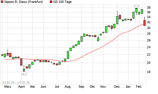 Mit dem Rücksetzer auf 30,80 EUR hat die Nippon Electric Glass-Aktie am 13.02.2026 die 100-Tage-Linie nach unten gekreuzt.Die Nippon Electric Glass-Aktie befindet sich seit dem 23.07.2025 ...weiterlesen