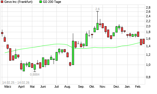 Mit dem Rücksetzer auf 1,46 EUR hat die GEVO-Aktie am 13.02.2026 die 200-Tage-Linie nach unten gekreuzt.Die GEVO-Aktie befand sich seit dem 09.02.2026 im langfristigen Aufwärtstrend und ...weiterlesen