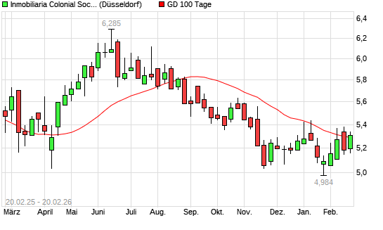 Mit dem Rücksetzer auf 5,23 EUR hat die Inmobiliaria Colonial-Aktie am 19.02.2026 die 100-Tage-Linie nach unten gekreuzt.Die Inmobiliaria Colonial-Aktie befindet sich seit ...weiterlesen