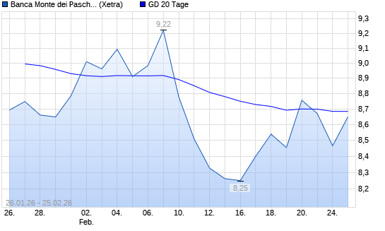 Mit dem Rücksetzer auf 8,46 EUR hat die Banca Monte Dei Paschi-Aktie am 24.02.2026 die 20-Tage-Linie nach unten gekreuzt.Die Banca Monte Dei Paschi-Aktie befindet sich seit ...weiterlesen