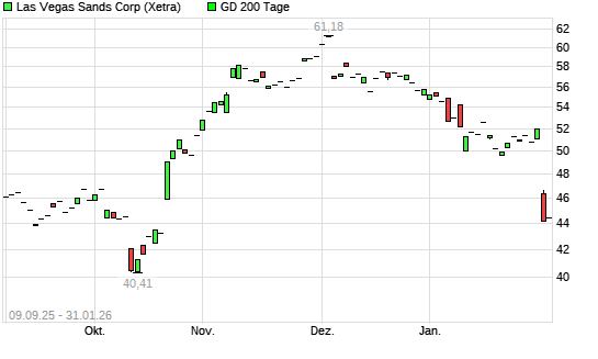 Mit dem Rücksetzer auf 44,30 EUR hat die Las Vegas Sands-Aktie am 30.01.2026 die 200-Tage-Linie nach unten gekreuzt.Die Las Vegas Sands-Aktie befand sich seit dem 14.10.2025 im langfristigen ...weiterlesen
