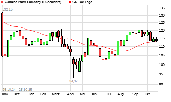 Mit dem Rücksetzer auf 112,55 EUR hat die Genuine Parts Company-Aktie am 24.10.2025 die 100-Tage-Linie nach unten gekreuzt.Die Genuine Parts Company-Aktie befindet sich seit dem 23.07.2025 ...weiterlesen