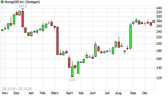 Mit dem Anstieg auf 287,15 EUR hat die MongoDB-Aktie (ISIN US60937P1066) am 24.10.2025 ein neues 6-Monats-Hoch erreicht und damit den Kurs vom 09.10.2025 eingestellt.Die MongoDB-Aktie befindet ...weiterlesen