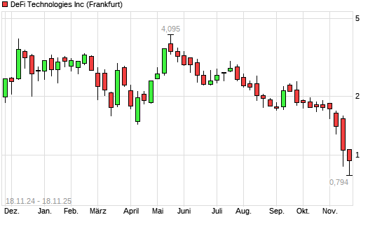 Mit dem Rücksetzer auf 0,90 EUR hat die Defi Technologies-Aktie (ISIN CA2449161025) am 17.11.2025 ein neues 12-Monats-Tief erreicht und damit den Kurs vom 14.11.2025 eingestellt.Die Defi ...weiterlesen