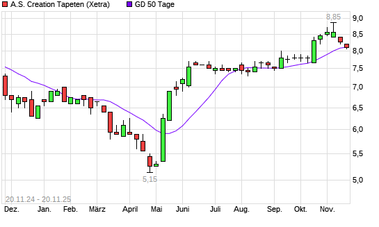 Mit dem Rücksetzer auf 7,80 EUR hat die A.S. Creation Tapeten-Aktie am 19.11.2025 die 50-Tage-Linie nach unten gekreuzt.Die A.S. Creation Tapeten-Aktie befindet sich seit dem 20.05.2025 ...weiterlesen