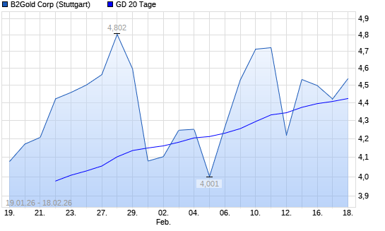 Mit dem Rücksetzer auf 4,34 EUR hat die B2Gold-Aktie am 17.02.2026 die 20-Tage-Linie nach unten gekreuzt.Die B2Gold-Aktie befindet sich seit dem 20.05.2025 im ...weiterlesen