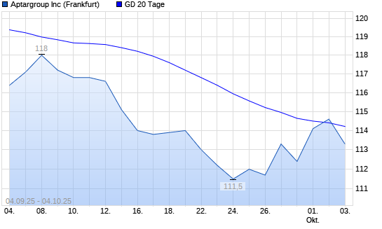Mit dem Rücksetzer auf 113,30 EUR hat die AptarGroup-Aktie am 03.10.2025 die 20-Tage-Linie nach unten gekreuzt.Die AptarGroup-Aktie befindet sich seit dem 10.02.2025 im langfristigen Abwärtstrend ...weiterlesen