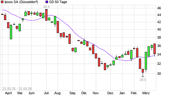 Mit dem Anstieg auf 34,08 EUR hat die Ipsos-Aktie am 20.03.2026 die 50-Tage-Linie nach oben gekreuzt.Die Ipsos-Aktie befindet sich seit dem 19.03.2026 im langfristigen Abwärtstrend und ...weiterlesen