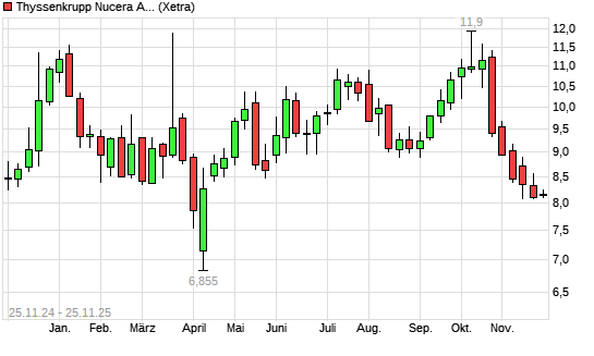 Mit dem Rücksetzer auf 7,90 EUR hat die thyssenkrupp nucera AG-Aktie (ISIN DE000NCA0001) am 24.11.2025 ein neues 6-Monats-Tief erreicht und damit den Kurs vom 18.11.2025 eingestellt.Die ...weiterlesen