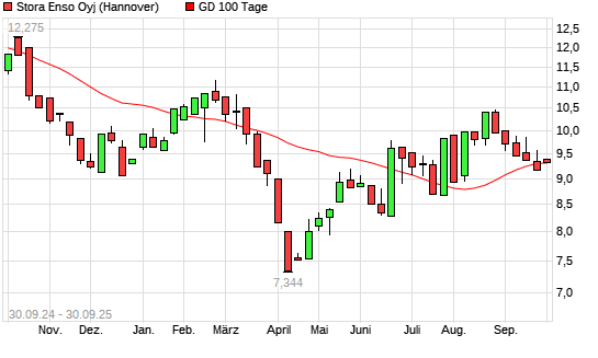 Mit dem Anstieg auf 9,35 EUR hat die Stora Enso R-Aktie am 29.09.2025 die 100-Tage-Linie nach oben gekreuzt.Die Stora Enso R-Aktie befindet sich seit dem 25.09.2025 im langfristigen Abwärtstrend ...weiterlesen