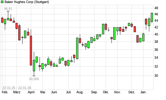 Mit dem Anstieg auf 44,84 EUR hat die Baker Hughes-Aktie (ISIN US05722G1004) am 21.01.2026 ein neues 6-Monats-Hoch erreicht und damit den Kurs vom 15.01.2026 eingestellt.Die ...weiterlesen