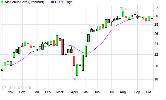 Mit dem Rücksetzer auf 29,40 EUR hat die API Group-Aktie am 06.10.2025 die 50-Tage-Linie nach unten gekreuzt.Die API Group-Aktie befindet sich seit dem 02.05.2025 im langfristigen Aufwärtstrend ...weiterlesen