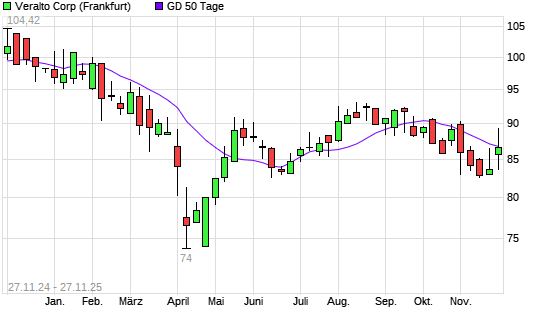 Mit dem Anstieg auf 87,05 EUR hat die VERALTO-Aktie am 26.11.2025 die 50-Tage-Linie nach oben gekreuzt.Die VERALTO-Aktie befindet sich seit dem 28.10.2025 im langfristigen Abwärtstrend und hat ...weiterlesen