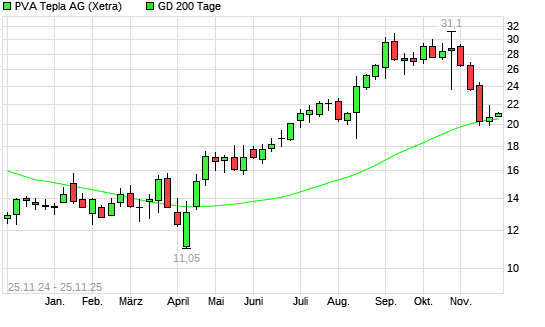 Mit dem Anstieg auf 21,00 EUR hat die PVA TePla-Aktie am 24.11.2025 die 200-Tage-Linie nach oben gekreuzt.Die PVA TePla-Aktie befand sich seit dem 21.11.2025 im langfristigen Abwärtstrend und ...weiterlesen