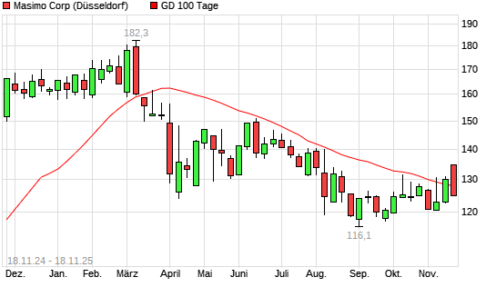 Mit dem Rücksetzer auf 127,10 EUR hat die Masimo-Aktie am 17.11.2025 die 100-Tage-Linie nach unten gekreuzt.Die Masimo-Aktie befindet sich seit dem 10.06.2025 im langfristigen Abwärtstrend ...weiterlesen