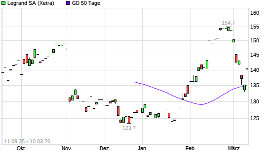 Mit dem Rücksetzer auf 137,30 EUR hat die Legrand-Aktie am 12.03.2026 die 50-Tage-Linie nach unten gekreuzt.Die Legrand-Aktie befindet sich seit dem 06.05.2025 im ...weiterlesen