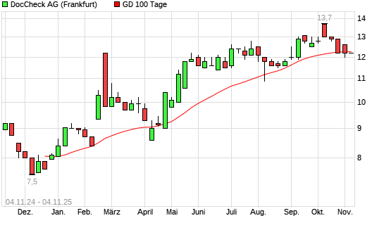 Mit dem Rücksetzer auf 12,20 EUR hat die DocCheck-Aktie am 03.11.2025 die 100-Tage-Linie nach unten gekreuzt.Die DocCheck-Aktie befindet sich seit dem 02.01.2025 im langfristigen Aufwärtstrend ...weiterlesen