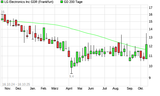 Mit dem Anstieg auf 12,70 EUR hat die LG Electronics GDR-Aktie am 15.10.2025 die 200-Tage-Linie nach oben gekreuzt.Die LG Electronics GDR-Aktie befand sich seit dem 13.08.2025 im langfristigen ...weiterlesen