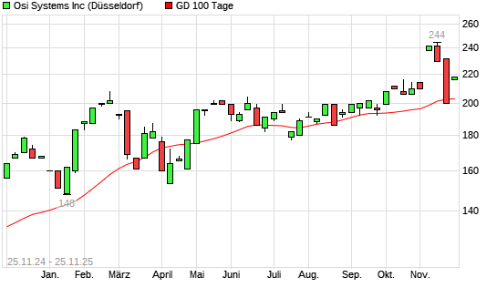 Mit dem Anstieg auf 212,00 EUR hat die OSI SYSTEMS-Aktie am 24.11.2025 die 100-Tage-Linie nach oben gekreuzt.Die OSI SYSTEMS-Aktie befindet sich seit dem 22.08.2025 im langfristigen Aufwärtstrend ...weiterlesen