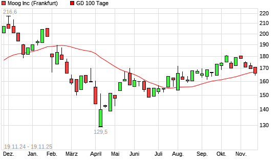 Mit dem Rücksetzer auf 167,30 EUR hat die Moog-Aktie am 18.11.2025 die 100-Tage-Linie nach unten gekreuzt.Die Moog-Aktie befindet sich seit dem 19.09.2025 im langfristigen Aufwärtstrend ...weiterlesen