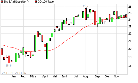 Mit dem Rücksetzer auf 24,28 EUR hat die Elis Ord Shs-Aktie am 26.11.2025 die 100-Tage-Linie nach unten gekreuzt.Die Elis Ord Shs-Aktie befindet sich seit dem 10.04.2025 im langfristigen ...weiterlesen