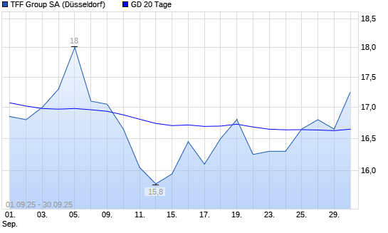 Mit dem Rücksetzer auf 16,55 EUR hat die TFF Group-Aktie am 29.09.2025 die 20-Tage-Linie nach unten gekreuzt.Die TFF Group-Aktie befindet sich seit dem 23.05.2024 im langfristigen Abwärtstrend ...weiterlesen