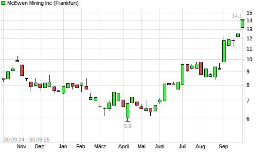 Mit dem Anstieg auf 13,70 EUR hat die McEwen Mining-Aktie (ISIN US58039P3055) am 29.09.2025 ein neues 3-Jahres-Hoch erreicht und damit den Kurs vom 23.09.2025 eingestellt.Die McEwen Mining-Aktie ...weiterlesen