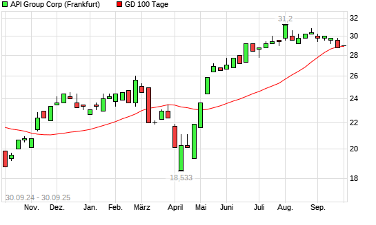 Mit dem Anstieg auf 29,00 EUR hat die API Group-Aktie am 29.09.2025 die 100-Tage-Linie nach oben gekreuzt.Die API Group-Aktie befindet sich seit dem 02.05.2025 im langfristigen Aufwärtstrend ...weiterlesen