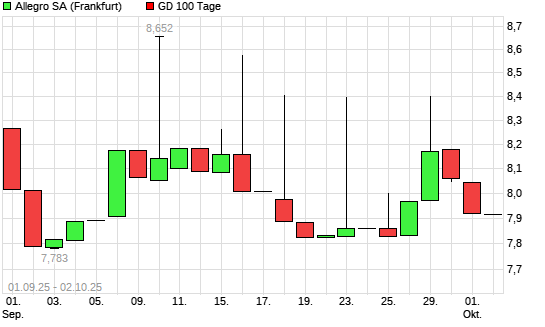 Mit dem Rücksetzer auf 7,80 EUR hat die Allegro-Aktie am 01.10.2025 die 100-Tage-Linie nach unten gekreuzt.Die Allegro-Aktie befindet sich seit dem 08.05.2025 im langfristigen Aufwärtstrend ...weiterlesen