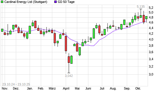 Mit dem Anstieg auf 4,76 EUR hat die Cardinal Energy-Aktie am 22.10.2025 die 50-Tage-Linie nach oben gekreuzt.Der Abstand zur 200-Tage-Linie beträgt aktuell +12,36%. ...weiterlesen