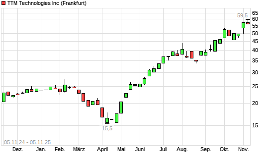 Mit dem Anstieg auf 59,50 EUR hat die TTM Technologies-Aktie (ISIN US87305R1095) am 04.11.2025 ein neues All-Time-High erreicht und damit den Kurs vom 03.11.2025 eingestellt.Die TTM Technologies-Aktie ...weiterlesen