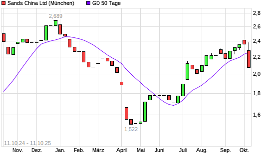 Mit dem Rücksetzer auf 2,07 EUR hat die Sands China-Aktie am 10.10.2025 die 50-Tage-Linie nach unten gekreuzt.Die Sands China-Aktie befindet sich seit dem 31.07.2025 im langfristigen Aufwärtstrend ...weiterlesen