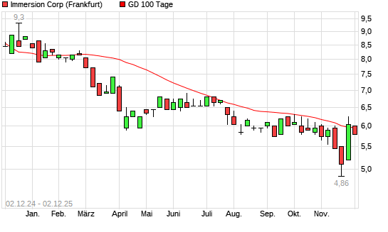 Mit dem Rücksetzer auf 5,80 EUR hat die Immersion-Aktie am 01.12.2025 die 100-Tage-Linie nach unten gekreuzt.Die Immersion-Aktie befindet sich seit dem 15.01.2025 im langfristigen Abwärtstrend ...weiterlesen