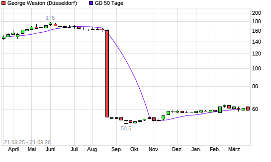 Mit dem Rücksetzer auf 60,00 EUR hat die George Weston-Aktie am 20.03.2026 die 50-Tage-Linie nach unten gekreuzt.Die George Weston-Aktie befindet sich seit dem 13.11.2025 ...weiterlesen