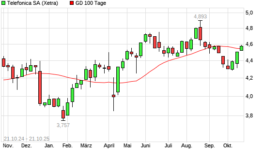 Mit dem Anstieg auf 4,59 EUR hat die Telefónica-Aktie am 20.10.2025 die 100-Tage-Linie nach oben gekreuzt.Die Telefónica-Aktie befindet sich seit dem 14.10.2025 im langfristigen Aufwärtstrend ...weiterlesen
