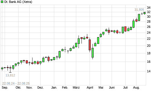 Mit dem Anstieg auf 31,62 EUR hat die Deutsche Bank-Aktie (ISIN DE0005140008) am 21.08.2025 ein neues 10-Jahres-Hoch erreicht und damit den Kurs vom 14.08.2025 eingestellt.Die Deutsche Bank-Aktie ...weiterlesen