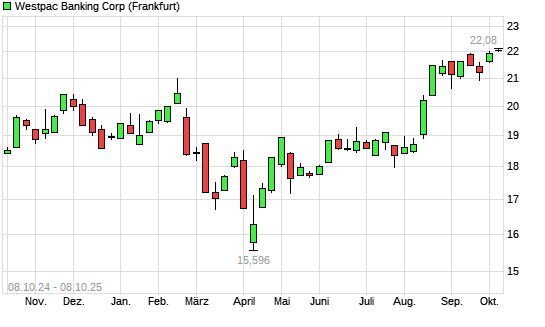 Mit dem Anstieg auf 22,08 EUR hat die Westpac Banking-Aktie (ISIN AU000000WBC1) am 07.10.2025 ein neues 5-Jahres-Hoch erreicht und damit den Kurs vom 06.10.2025 eingestellt.Die Westpac Banking-Aktie ...weiterlesen