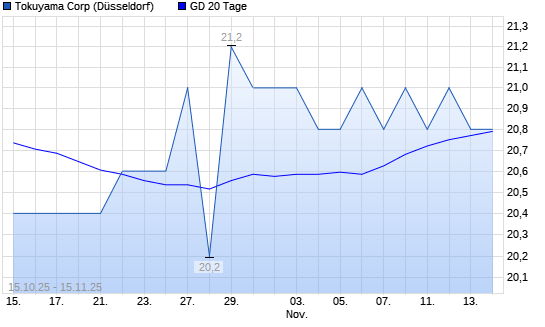 Mit dem Rücksetzer auf 21,00 EUR hat die Tokuyama-Aktie am 14.11.2025 die 20-Tage-Linie nach unten gekreuzt.Die Tokuyama-Aktie befindet sich seit dem 21.05.2025 im langfristigen Aufwärtstrend ...weiterlesen