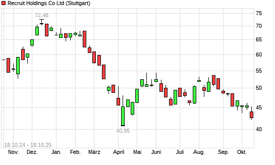 Mit dem Rücksetzer auf 42,33 EUR hat die Recruit Holdings-Aktie (ISIN JP3970300004) am 17.10.2025 ein neues 6-Monats-Tief erreicht und damit den Kurs vom 23.04.2025 eingestellt.Die Recruit ...weiterlesen