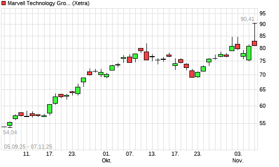 Mit dem Anstieg auf 82,42 EUR hat die Marvell Technlogy Group-Aktie (ISIN US5738741041) am 06.11.2025 ein neues 6-Monats-Hoch erreicht und damit den Kurs vom 05.11.2025 eingestellt.Die Marvell ...weiterlesen