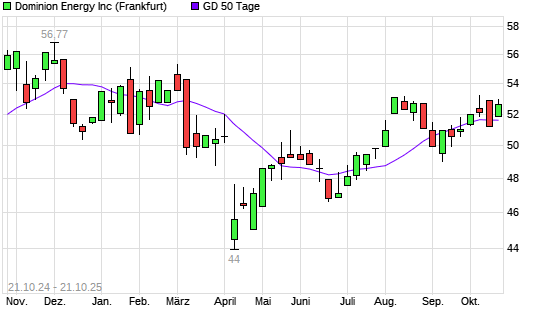 Mit dem Anstieg auf 52,98 EUR hat die Dominion Energy-Aktie am 20.10.2025 die 50-Tage-Linie nach oben gekreuzt.Die Dominion Energy-Aktie befindet sich seit dem 18.09.2025 im langfristigen Aufwärtstrend ...weiterlesen